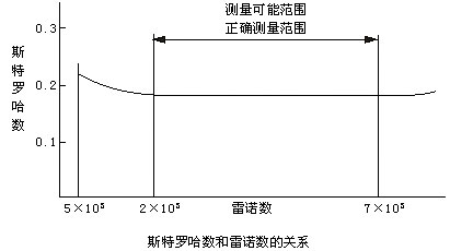 卡門(mén)渦街釋放頻率f和流速v成正比,因此通過(guò)測(cè)量卡門(mén)渦街釋放頻率就可算出瞬時(shí)流量。斯特羅哈數(shù)是渦街流量計(jì)的重要系數(shù)。在曲線(xiàn)的St≈0.17的平直部分,旋渦的釋放頻率與流速成正比,所以檢出頻率f就可求得流速v,由v求出體積流量。 |